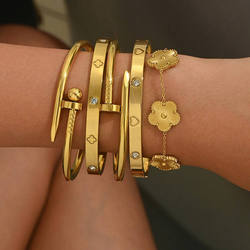 สร้อยข้อมือสแตนเลสสตีลสีทอง18K สร้อยข้อมือแฟชั่นชุดเล็บดอกไม้สร้อยข้อมือเพทายสำหรับคู่รักสินค้าขายดีคุณภาพสูง